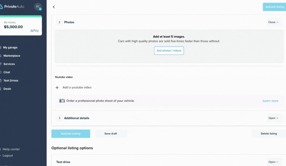 12. If you want professional photos taken, you can order professional photos through our partner CarLife directly in the app, and the photos will be uploaded into your listing as soon as they are ready and available. Not all zip codes are available but they are consistently adding new service areas.