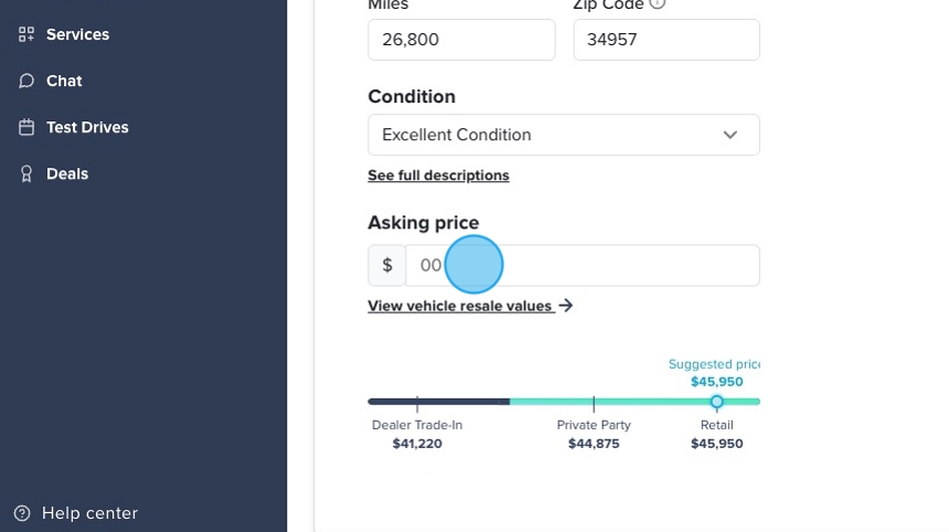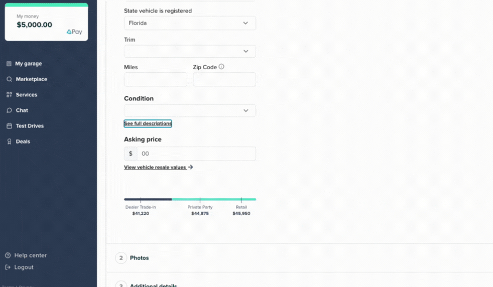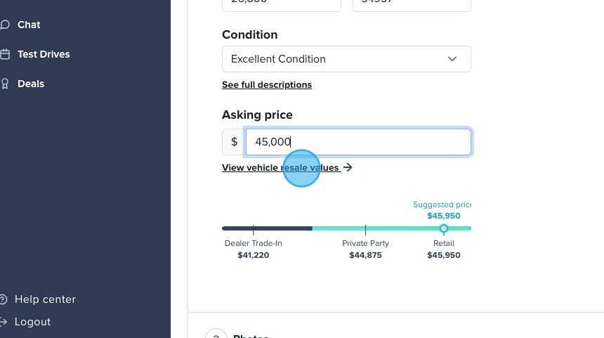 9. We give you a range of vehicle values to help you decide on a price for your vehicle here. Once your listing is live you can edit this price at anytime if needed.