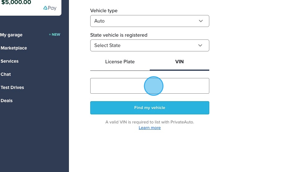 3. Select your Vehicle type, the state the vehicle is registered in, and your License place or VIN by toggling to your choice.