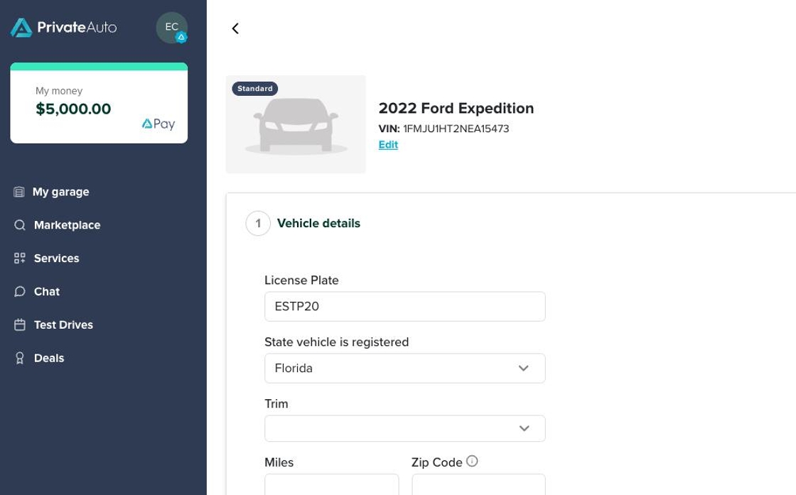 6. You will need to fill in all of your vehicle details including plate, Trim, miles, and the zip code where the vehicle is located.