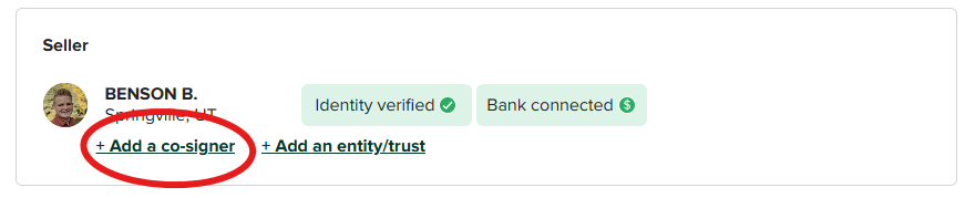 1. Click the "+ Add a co-signer" hyperlink below the sellers name in the party section