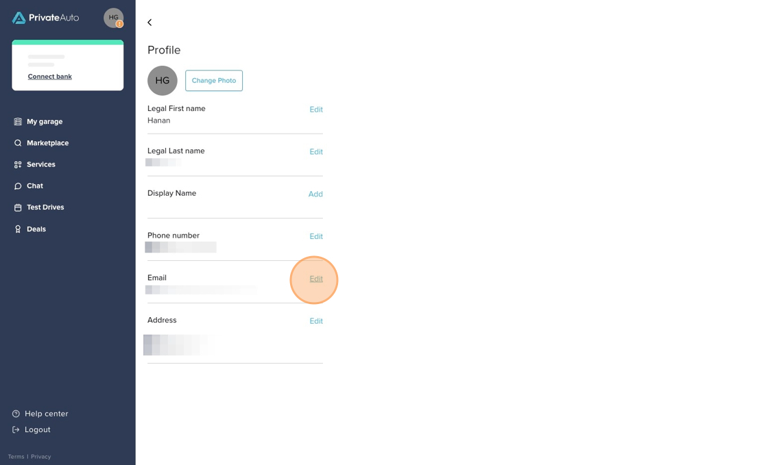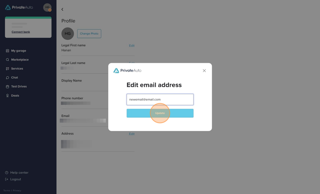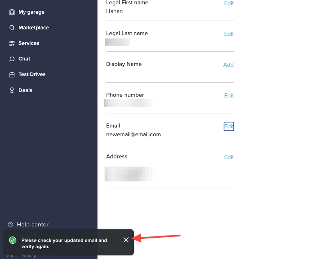 4. You will be directed to your PrivateAuto account with a message verifying that your email has been successfully changed, and you will now see the new email address next to the email section on the main page. You will then need to verify the new email.