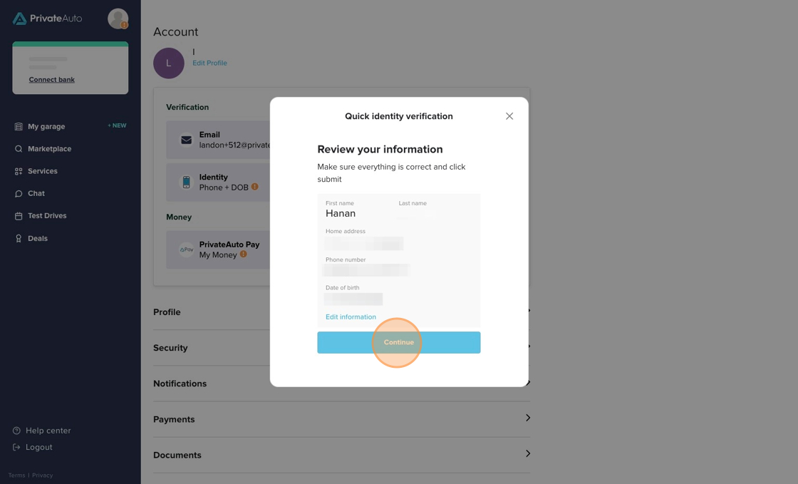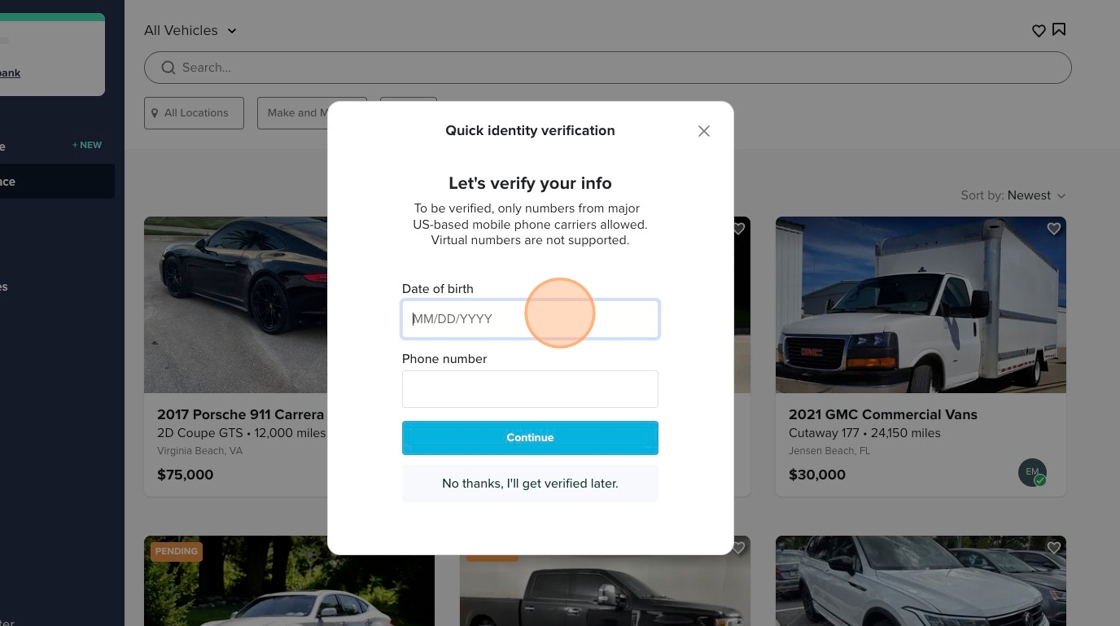 1. Once your account is created, you will be asked to verify your info by entering your date of birth and phone number. You will enter your date of birth and phone number and click "Continue"