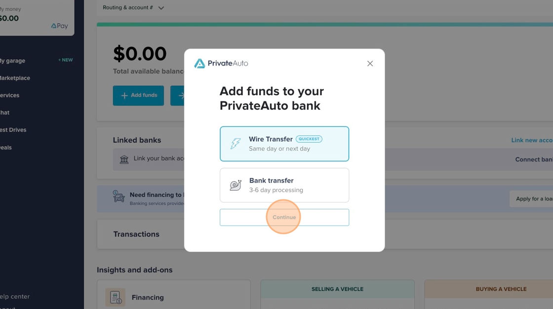 The information below explains how to initiate a wire or ACH transfer from the money page of your PrivateAuto account.